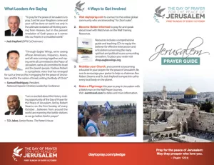We have developed many downloadable resources for the Day of Prayer for the Peace of Jerusalem to equip you to participate in this global movement of prayer. Check out the items available below, and join us this October, and throughout the year!